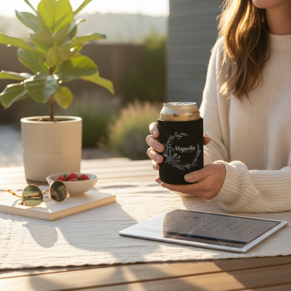 Keep your drinks perfectly chilled in style with our Magnolia Beauty Bar Can Cooler. Crafted from soft jersey knit cloth with a foam backing, this slim can holder provides reliable insulation while staying lightweight and easy to carry. The collapsible design folds flat, making it a convenient companion for any outing—whether you’re at the salon, poolside, or on the go. Finished with the Magnolia Beauty Bar logo, it’s both practical and brand-right.