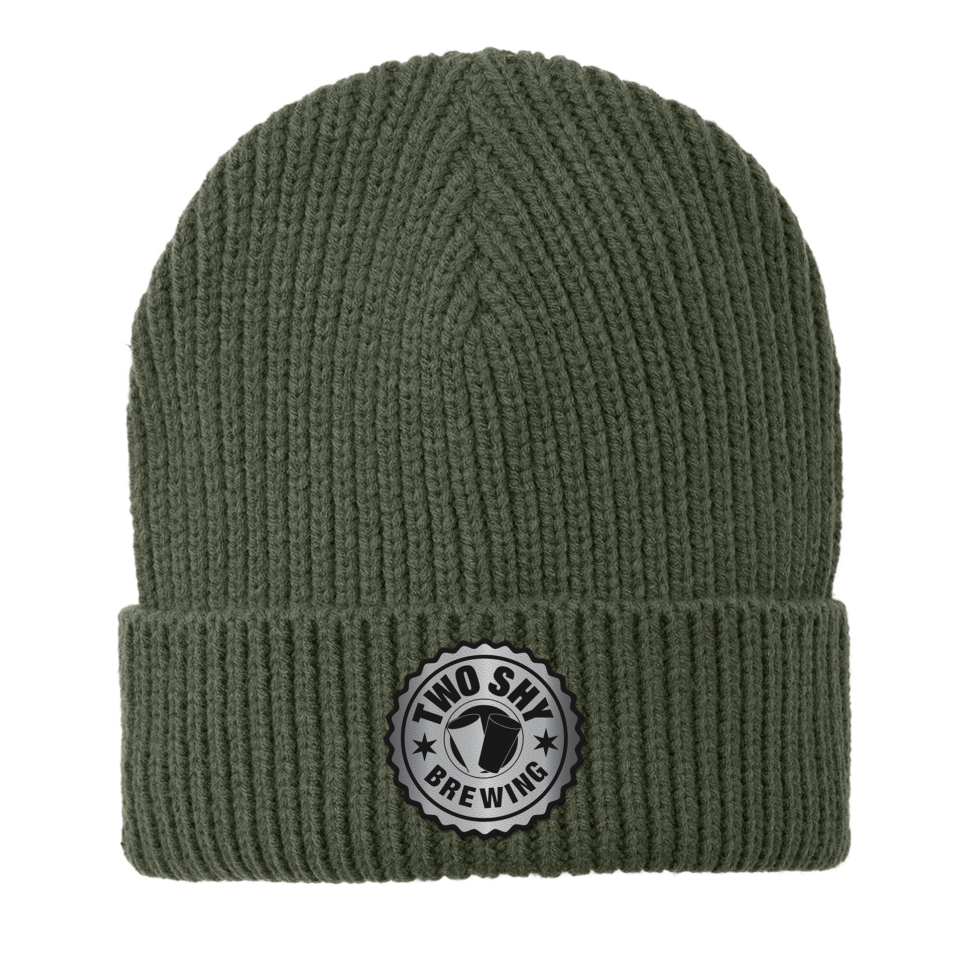 A classic cold-weather staple with a premium finish. This fold-over, chunky rib knit watch beanie features a laser-engraved leatherette patch of the Two Shy Brewing logo, securely sewn (embroidered) to the cuff for lasting wear.